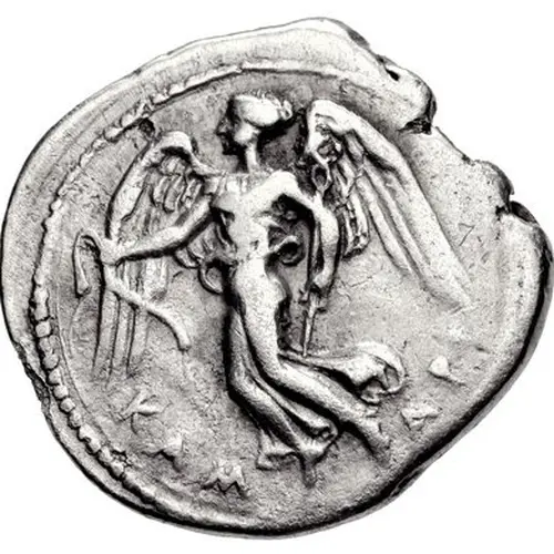 توضیحات روی سکه Nike, wearing a long chiton, wings spread, flying left, holding fillet in right hand and a kerykeion on the left.