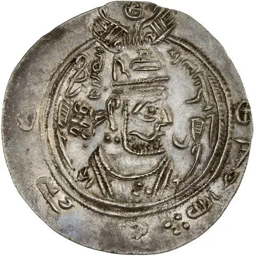 | Obverse description | Sasanian bust right with winged mural crown, two borders, stars in crescents in margin; 4 pellets after bism Allam. |