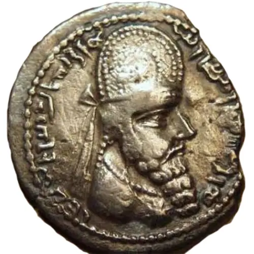| Descrição do anverso | A portrait of the king facing right, in Parthian-style headdress (kulah) edged along the borders with tow rows of `pearls`. There is an ornament made of `pearls` on the kulah. The central ornament is a six-pointed star. The hair covered by bashlyk edged with `pearls`, and ribbons with bows flow out from the kulah. Around his neck the King wears a necklace in the form of tow hoops. There is a pointed rim around the picture. Middle Persian (Pahlavi) legend |