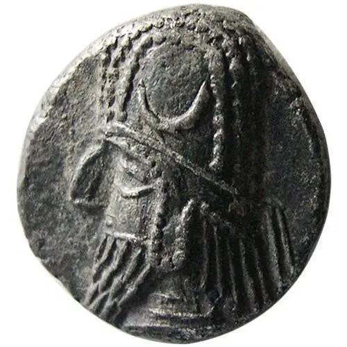 | Описание аверса | Bearded bust left, wearing diadem and Parthian-style tiara with crescent and three rows of pellets. |