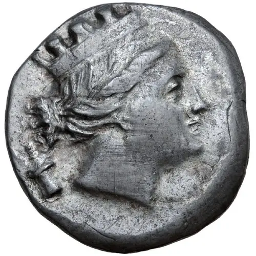 | Descrizione del dritto | Turreted head of Artemis to right, bow and quiver behind neck. |