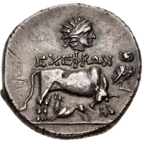 | Descripción del anverso | Cow suckling a calf, head of Sol (sun) above, owl in right field, magistrate name above |