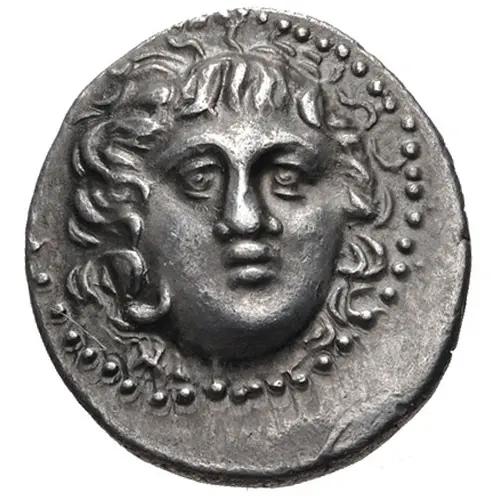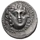 | Aversbeschreibung | Facing head of Apollo-Helios, turned slightly right; dotted border. |