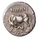 Obverse description Cow standing left with suckling calf, magistrate name above, caduceus (staff of Hermes) below. Dotted border.