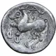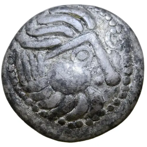 Obverse description Celticised, laureate and bearded head of Zeus to right.