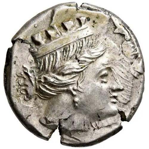 | Popis líce | Turreted head of Artemis to right, bow and quiver behind neck. |