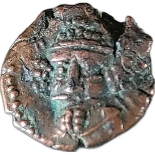 | Obverse description | Bare-headed bust, facing, w/diadem, and 2 loops; 2 round tufts of hair on sides, one smaller oblong tuft on top of the head, mustache, chin beard, necklace. |