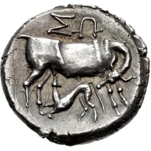 | Описание аверса | Cow standing right, looking back at suckling calf standing left below; ΣΩ above. |