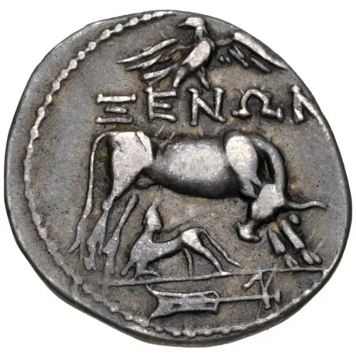 | Ön yüz açıklaması | Cow standing right, looking back at suckling calf standing left below; above, eagle standing right, head left and wings spread, above ΞΕΝΩΝ; rudder in exergue. |