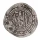 Opis rewersu Standing figure facing wearing armour and helmet with ‘weather-vane’ crest, holding spear vertically in left hand, right hand on pommel of sheathed sword at his waist. In field (in Pahlawi) ANBYR to left, date to right In first and second quadrants of margin: Hephthalite legend In fourth and third quadrants of margin (Script in Arabic)