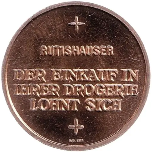 | Obverse lettering | + RUTISHAUSER DER EINKAUF IN IHRER DROGERIE LOHNT SICH + HUGUENIN (Translation: Rutishauser, your drugstore purchases are well worth it.) |
