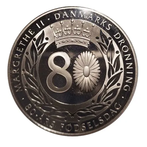 | Leyenda del anverso | Margrethe II, Danmarks dronning, 80-ARS FODSELSDAG (Translation: Margrethe II, Queen of Denmark, 80th Birthday) |