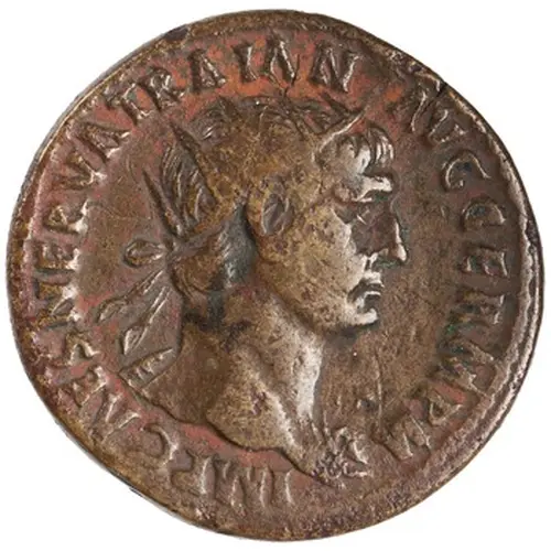 | نوشتههای روی سکه | IMP CAES NERVA TRAIAN AVG GERM P M (Translation: Imperator Caesar Nerva Traianus Augustus, Germanicus, Pontifex Maximus. Supreme commander (Imperator), Caesar, Nerva Trajan, emperor (Augustus), conqueror of the Germans, high priest.) |
