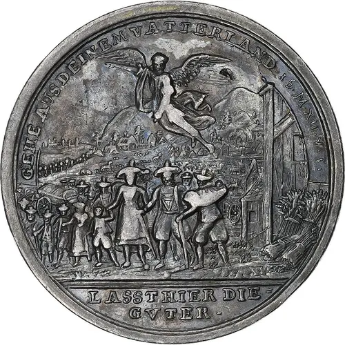| Описание аверса | Protestants leaving a mountainous region, with an angel floating above them, showing them the way. |