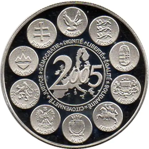 | نوشتههای روی مدال | CHYPRE ESTONIE HONGRIE LETTONIE LITUANIE MALTE POLOGNE RÉPUBLIQUE TCHÈQUE SLOVÉNIE SLOVAQUIE DIGNITÉ ★ LIBERTÉ ★ ÉGALITÉ ★ SOLIDARITÉ ★ CITOYENNETÉ ★ JUSTICE ★ DÉMOCRATIE ★ 2005 |