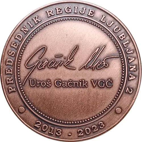 | Надписи аверса | PREDSEDNIK REGIJE LJUBLJANA Gačnik Uroš Uroš Gačnik VGČ 2013 - 2023 |