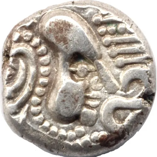 | Descrizione del dritto | Derivative coins during the Chavada (AD 746-942), the Chalukya (AD 942-1243), and Vaghela (AD 1244-1297) dynasties of Gujarat. This one is a curve head type |