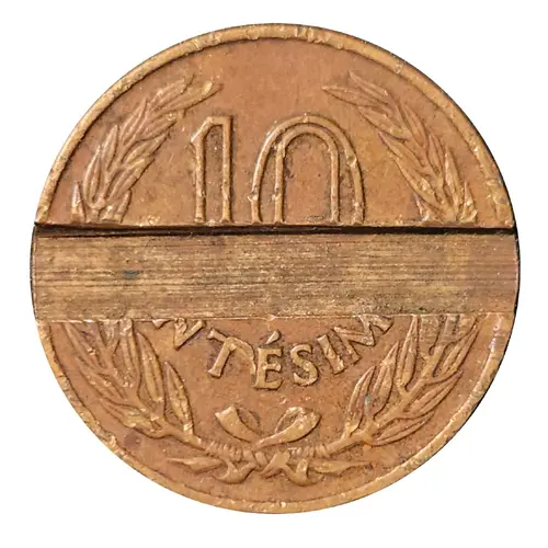 | Obverse description | Post mintage made groove on Uruguayan coin KM# 39. (Host coin) Face value within wreath of laurel and olive. Acanalado hecho sobre moneda uruguaya KM# 39 (Moneda original) Valor facial entre ramas de laurel y olivo. |