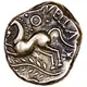 | Beschrijving keerzijde | Naturalistic, leaping horse left with pellet mane, extended front and rear legs. Leafy, arched branch below. Ringed pellet in pellet triangle above and ringed pellet below. Star in front and behind. Inscription around. |