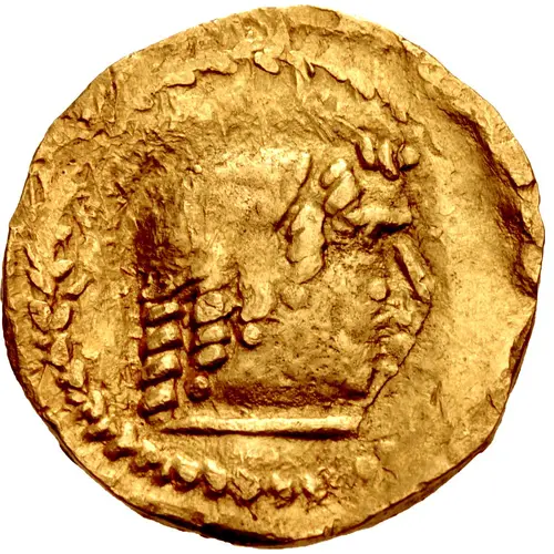 | Descripción del anverso | Head of male right, wearing laurel wreath, within dotted border. |