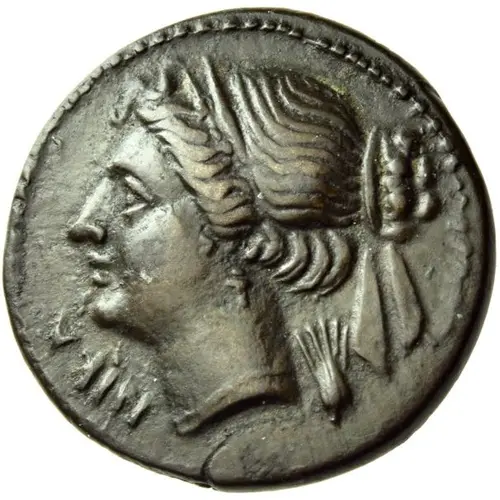 | Obverse description | Head of Nike to left, with her hair bound with a taenia and tied in a bun at the back, wearing a pendant earring and a plain necklace; behind her neck, grain ear. |