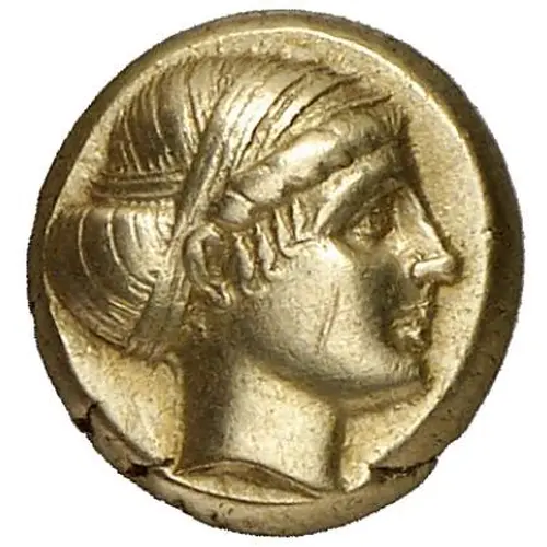 | Obverse description | Female head to right, her hair bound up with criss-crossing ribbons |