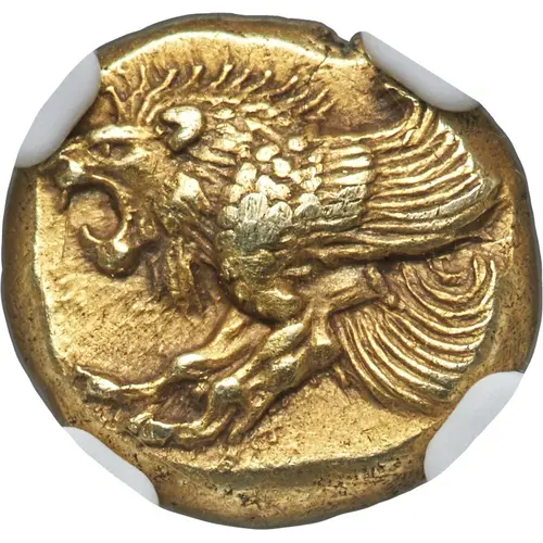 Descripción del anverso Forepart of winged lion left, jaws open, mane bristling, forelegs outstretched