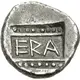 Описание реверса ERA in oblong compartment between two lines with a row of beads above and below. All within incuse square