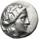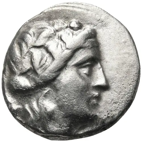 | Obverse description | Wreathed head of young Dionysos right; thyrsos behind. |