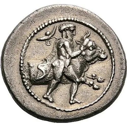 | Descripción del anverso | Youthful hero, Thessalos, nude but for cloak and petasos hanging over his shoulder, striding right, holding a band in both his hands around the head of the forepart of a bull moving right |