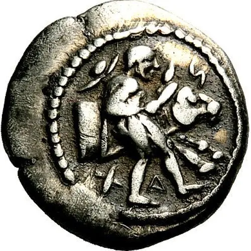 | Popis líce | Youthful Hero (Thessalos) walking right, nude but for cloak and petasos tied over his shoulders, restraining the forepart of a bull rushing to right with a band held around the bull’s head |