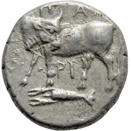 | Descrizione del dritto | Bull standing left, head right; below, lobster left. |