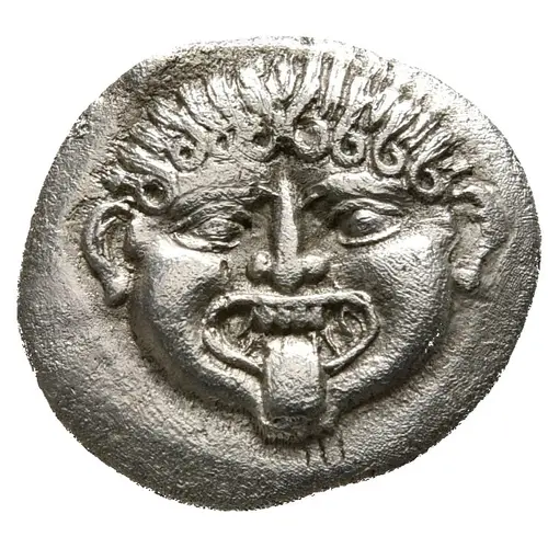 | توضیحات روی سکه | Gorgoneion facing with protruding tongue |