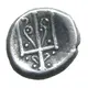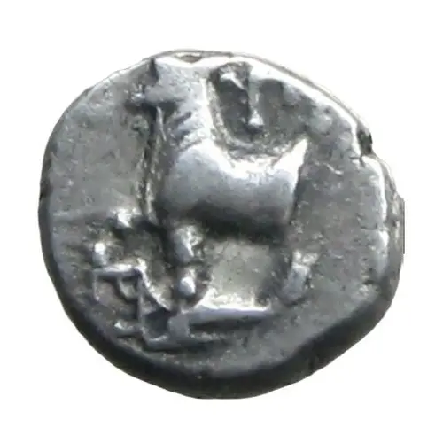 表面の説明 Forepart of bull, left, standing on dolphin Monogram above