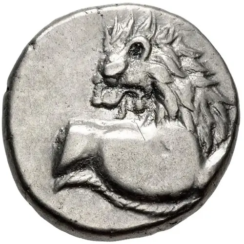 | Aversbeschreibung | Forepart of a lion to right, head turned back to left. |