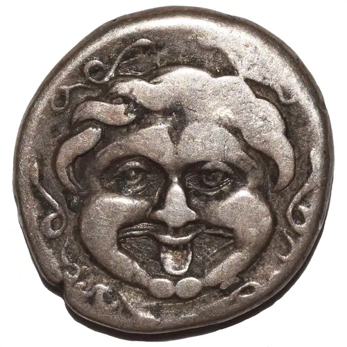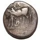 | Reverse description | Bull standing left, head turned back to right, monogram above, branch below. |