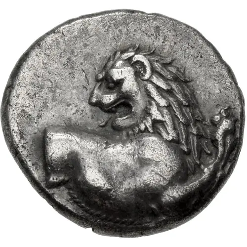 | Description de l’avers | Forepart of a lion to right, head turned back to left. |