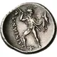 | Reverse description | The hero Phemios, nude but for a belt holding a short sword in a scabbard and a chlamys draped over his shoulders and his left arm, standing left, facing front with his head turned to right, hurling a javelin with his right hand and holding his petasos, as if it were a small shield, with his left. On the ground line between his feet, sideways Φ |