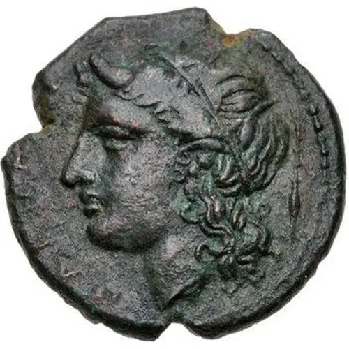 Mô tả mặt trước Wreathed and horned head of river god left; thunderbolt to right.