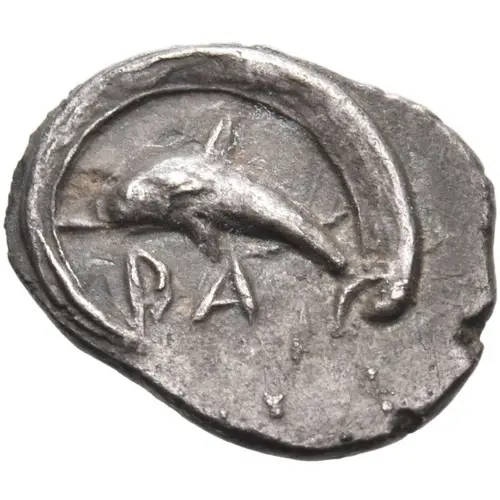 | Obverse description | Dolphin swimming to left within the crescent-shaped harbour of Zankle. |