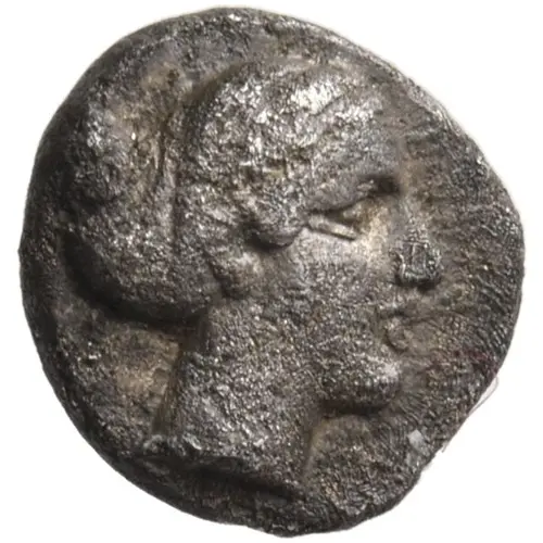 | Aversbeschreibung | Head of Aphrodite or a nymph right, hair bound in a sphendone. |