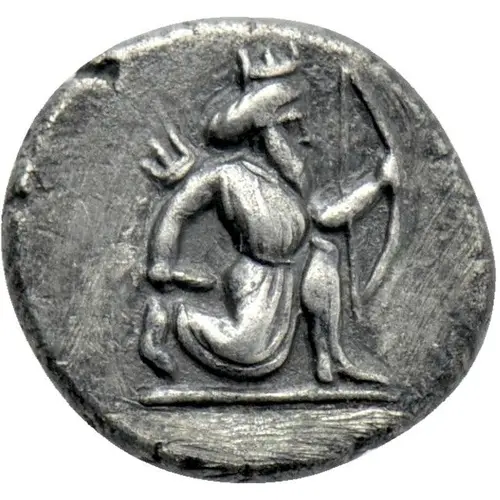 Mô tả mặt trước Persian hero-king right, in running-kneeling position holding bow and dagger; groundline.
