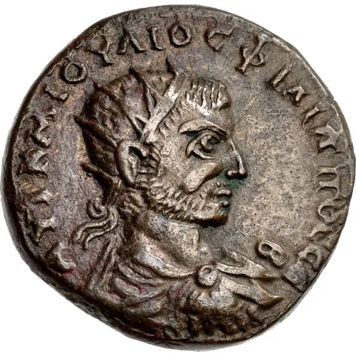 ΑΥΤ Κ Μ ΙΟΥΛΙΟϹ ΦΙΛΙΠΠΟϹ ϹΕΒ (Translation: Imperator Caesar Marcus Iulius Philippus Augustus) |
