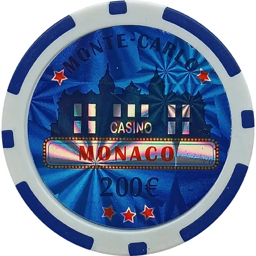 (fr) Le casino stylisé en noir, fenêtres en blanc au dessus d`un cartouche, le tout sur un fond de couleur bleu et l`ensemble dans un cercle blanc doublé d`un deuxième cercle bleu et blanc. Valeur faciale en exergue. |