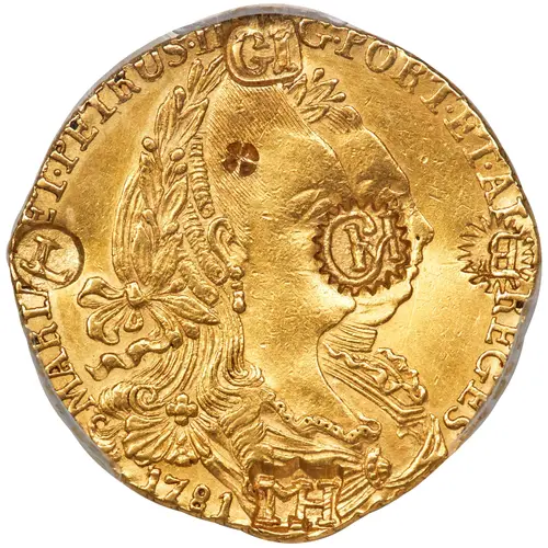 | 正面描述 | Host coin (1/2 Dobra of 1781) with double portrait of Mary I and Pedro III of Portugal facing right surrounded by text in Latin. Date of hostcoin below. Four countermarks at 3, 6, 9 and 12 o`clock very close to the edge (GI, L, MH and B) and one countermark on the field (GH). |