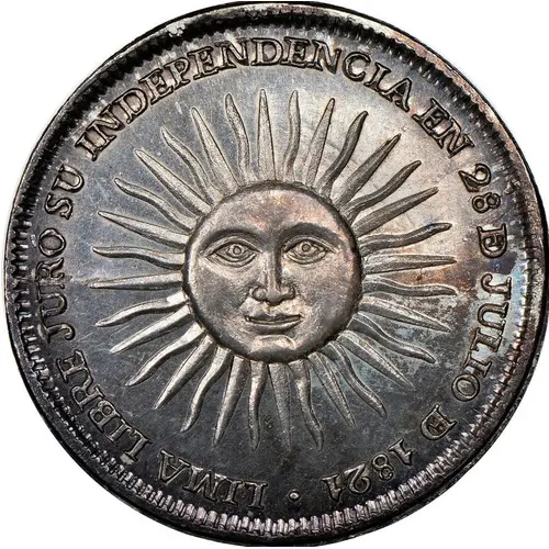 | Chữ khắc mặt trước | LIMA LIBRE JURÓ SU INDEPENDENCIA EN 28 DE JULIO DE 1821 (Translation: Free Lima swore her independence on July 28th of 1821) |