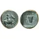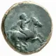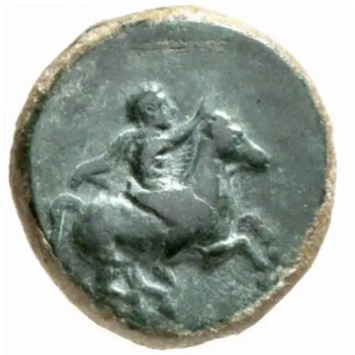 | Aversbeschreibung | Horseman with flying chlamys (ancient Greek cloak) riding right with raised right arm in greeting. |