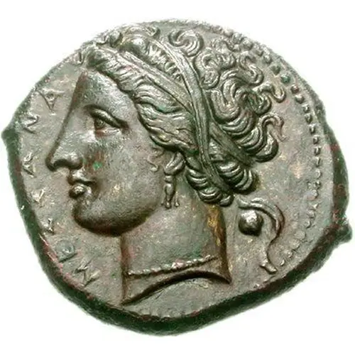 | Obverse description | Head of the nymph Messana left, hair in band, wearing triple-pendant earring and necklace; MEΣΣANA before, shell and dolphin behind. |