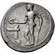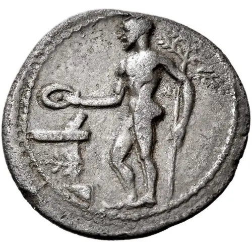 | Descrição do anverso | Apollo, nude, standing left holding phiale in his right hand and branch in his left; to left, altar potent on step. |
