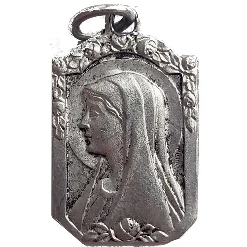 Obverse description The Virgin Mary haloed, facing left, floral patterned frame.